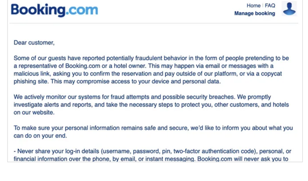 If you receive a message ostensibly from Booking.com, urging you to provide your credit card details, don’t comply. Instead, contact Booking.com directly.