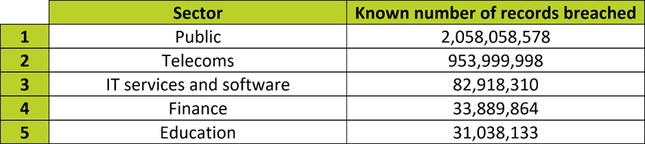 Note: To make this table as informative as possible, we’ve excluded the ‘multiple’, ‘other’ and ‘unknown’ sectors. If we hadn’t, ‘multiple’ would have been in the top spot at 26,000,000,001 known records breached due to the MOAB, and ‘unknown’ would have ranked fourth at 293,840,772 known records breached, largely due to the unknown Brazilian organisation breached.