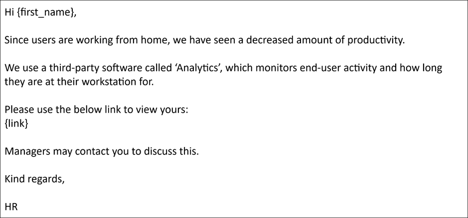 Then, I screenshot that email, and send out another email, pretending to be IT, saying something like: “This email has been circling around the organisation this morning. Here’s a list of users that have clicked the link.”