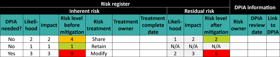 Depending on your needs, you may want to use slightly different columns, but I recommend tracking your risks in your ROPAs, as this takes advantage of the fact you’ve listed out all your processing activities. In effect, those records are your asset register – a key element to an asset-based risk assessment, which is a skill that’s fundamental to data protection, privacy and information security management